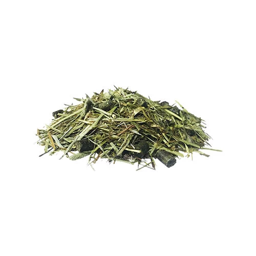 Luzerne, Gerstenstroh, Haferstängel, Weizenkleie, Zuckerrohrmelasse, Gras, Gerste, Sojaöl und Mineralstoffe.
