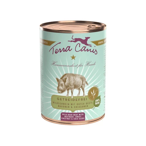 Terra Canis getreidefrei – Wildschwein ist ein leckeres, getreidefreies Nassfutter für Hunde. Aufgrund seines hohen Fleischanteils ist es leicht verdaulich und ideal für Hunde mit empfindlichem Magen.
